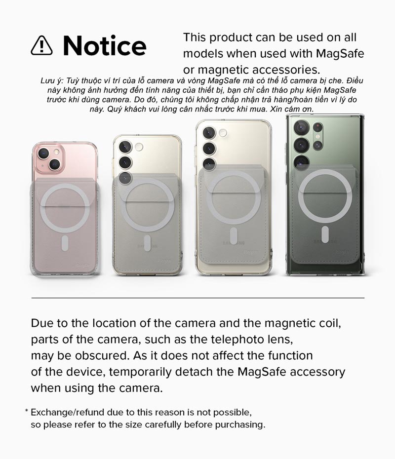 - Tuỳ thuộc vào vị trí lỗ camera của thiết bị và vòng MagSafe mà sản phẩm có thể che lỗ camera. Điều này không làm ảnh hưởng đến tính năng của thiết bị, bạn chỉ cần tháo phụ kiện MagSafe trước khi dùng camera. Do đó, chúng tôi không chấp nhận trả hàng/hoàn tiền vì lý do này. Quý khách vui lòng cân nhắc trước khi mua.