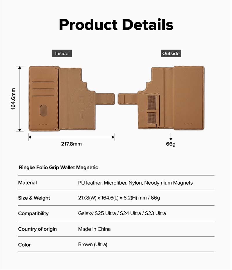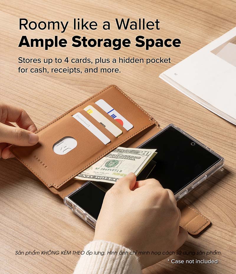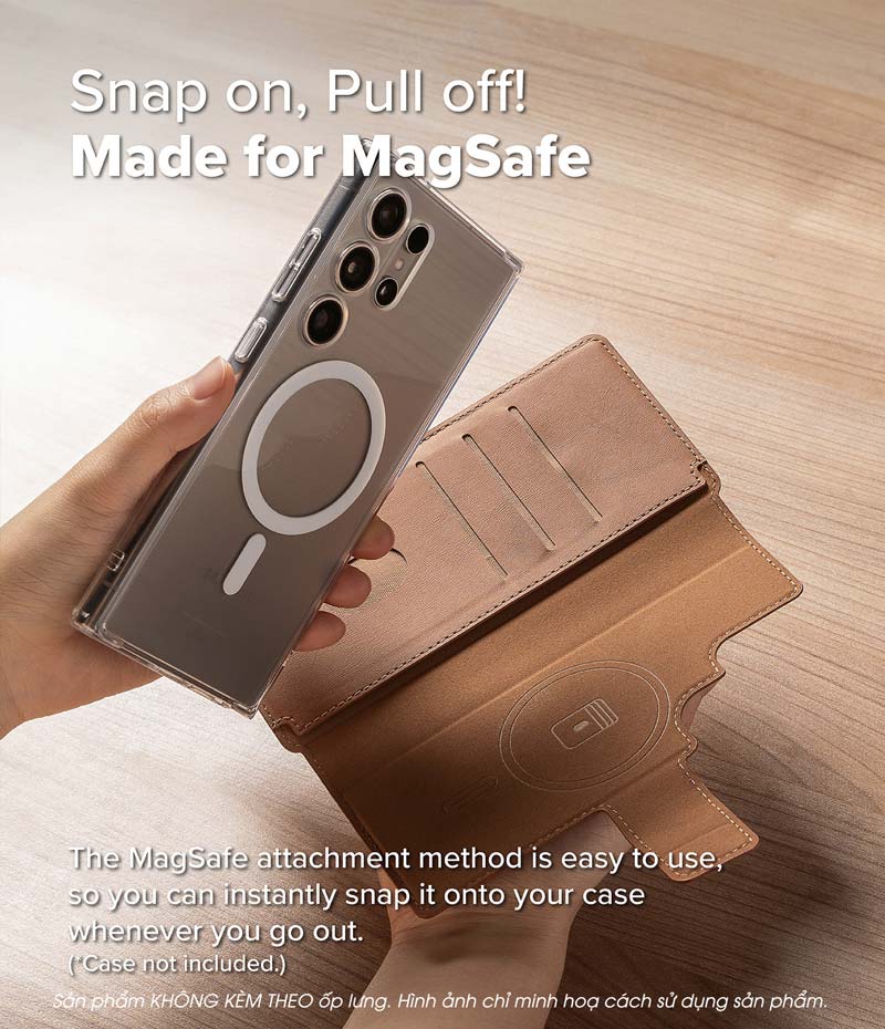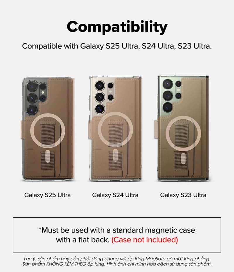 - Ringke Folio Grip Wallet Magnetic là sản phẩm tích hợp 2 tính năng trong một: ví đựng thẻ kiêm giá đỡ và cần được dùng chung với ốp lưng MagSafe dành riêng cho dòng máy Galaxy S25 Ultra/S24 Ultra/S23 Ultra.