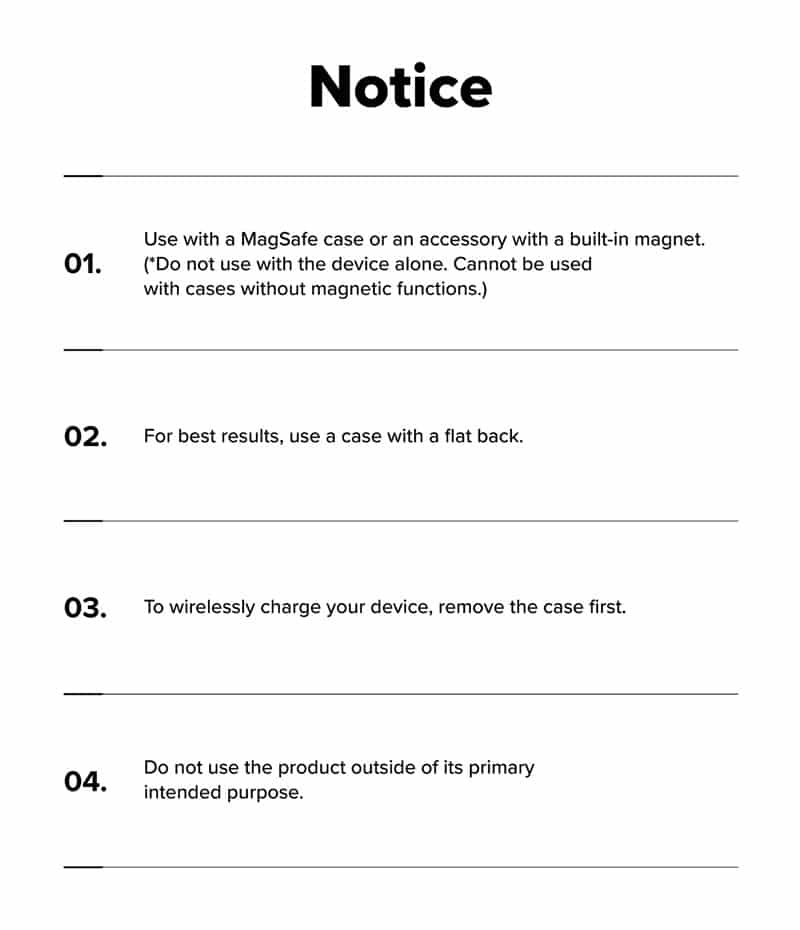 - Sản phẩm cần được dùng với ốp lưng từ tính Magnetic và có mặt lưng phẳng, không gồ ghề. Ốp lưng cần được mua riêng.